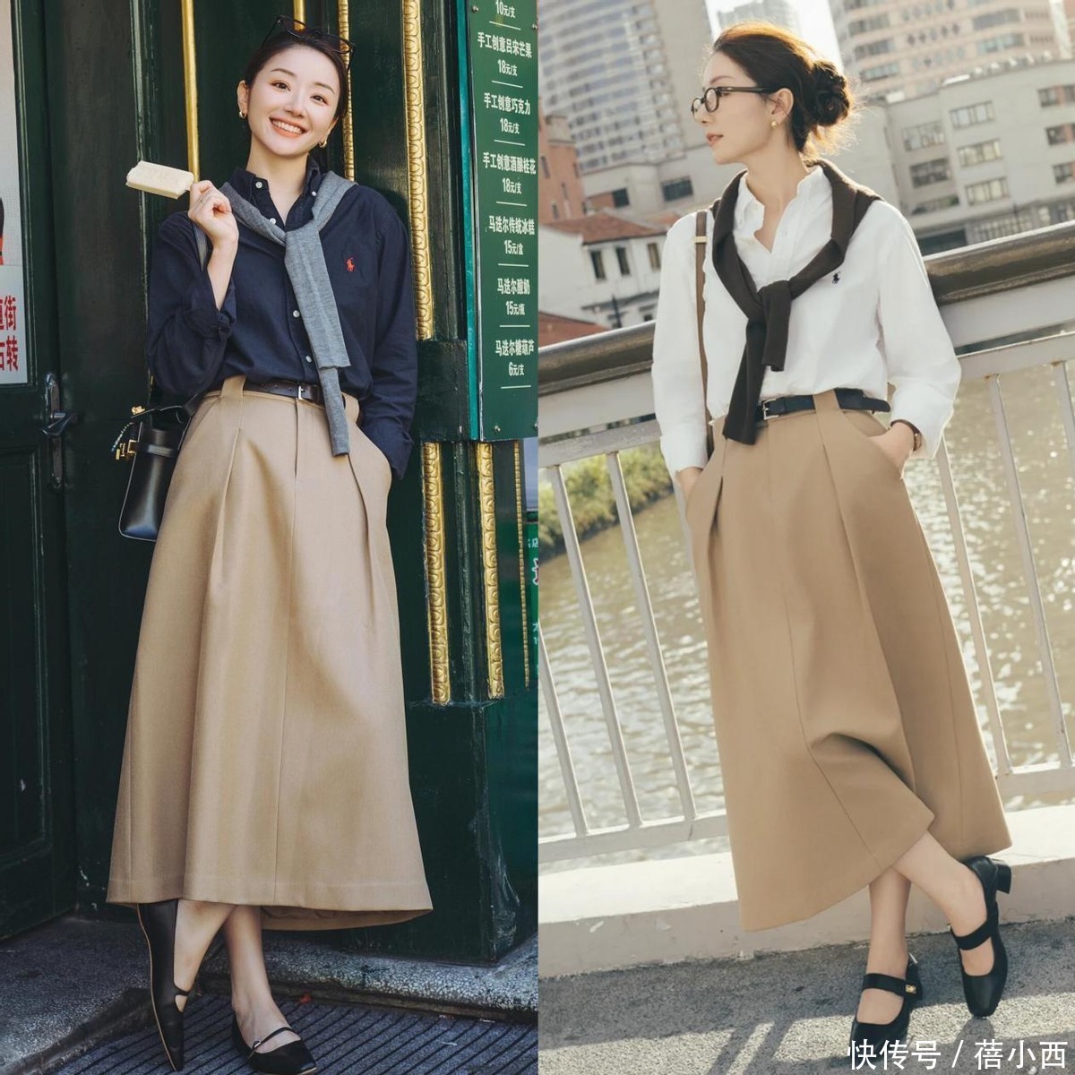 搭配的时候还有个小技巧,把衬衫下摆塞进半裙里,轻轻拉出来一点点,打造慵懒感,还能拉高腰线,瞬间穿出三七分身材,小个子穿了显高,微胖穿了显瘦。脚上配一双低跟小皮鞋、乐福鞋,或者温柔的单鞋,露出纤细的脚踝,整个人看起来知性又大方,走在街上,谁看了都得说一句气质好。