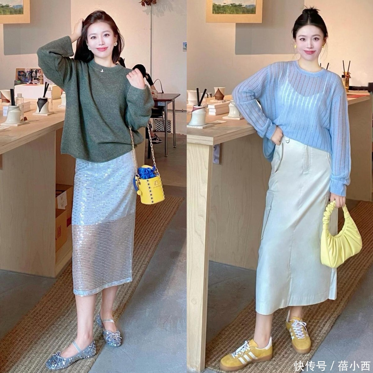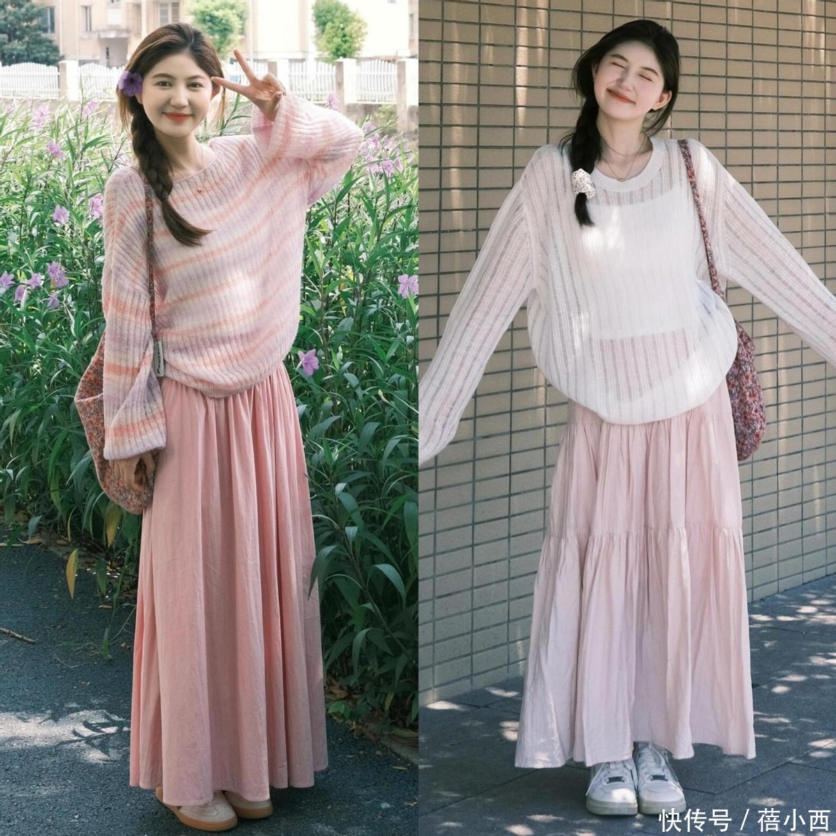 针织衫搭配半裙就更温柔了,选款也很简单,不用选太花哨的,纯色的修身款、微宽松款都可以,米白、奶咖、浅灰、焦糖色,都是春日氛围感满满的颜色,和各种半裙都能搭。
