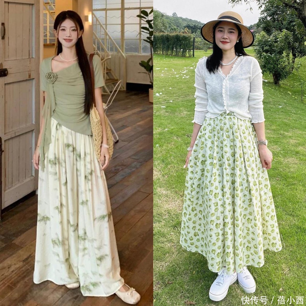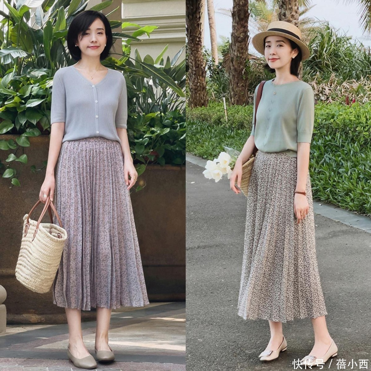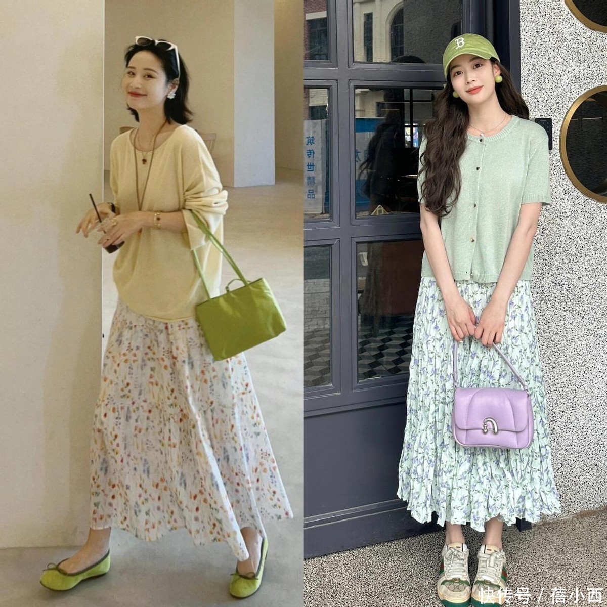 半裙可以选碎花款、百褶款,或者温柔的纱裙、棉麻裙,风格一下就多样化了起来。比如下面的搭配,用温柔知性的纯色针织衫,搭配轻盈的薄纱半身裙,厚薄结合,不但不沉闷臃肿,还可以提升搭配层次感。